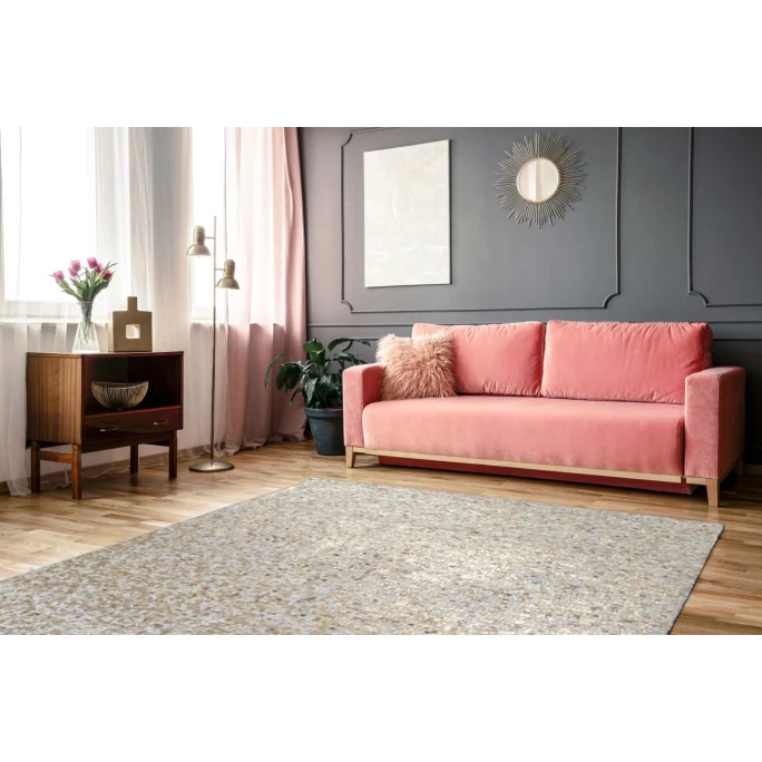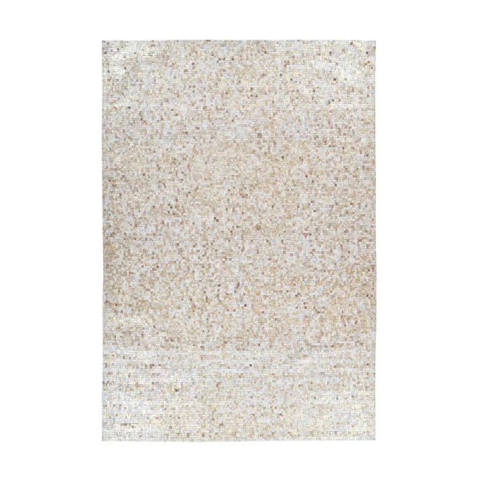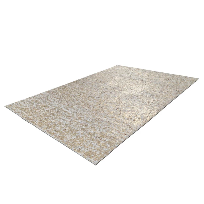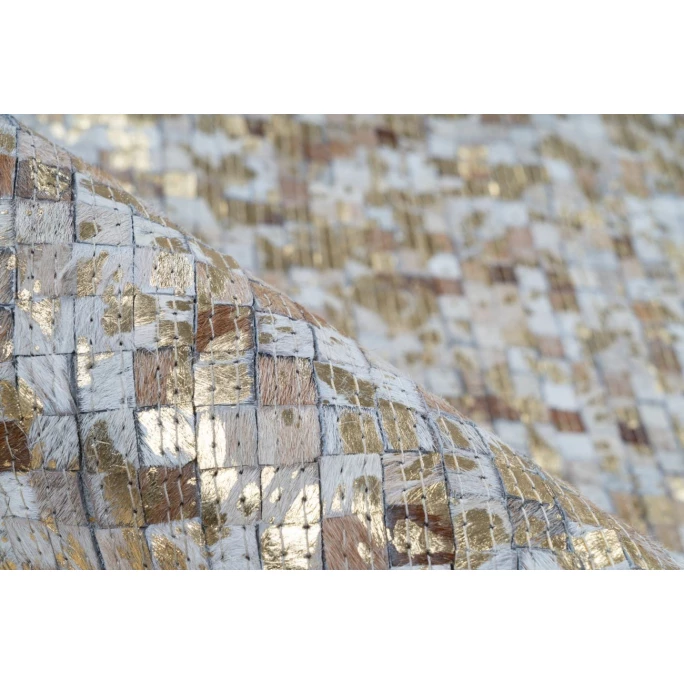 Dieses Teppichmodell hat einige positive Eigenschaften. Der Flor wurde in Handarbeit aus vielen kleinen quadratischen Teilen liebevoll zusammengesetzt und ist ein einzigartiges Unikat. Natürliche Lederstücke in verschiedenen Farbabstufungen erzeugen ein raffiniertes Patchwork-Muster, das schnell ein Hingucker im Raum wird. Metallische Effekte verleihen dem Naturteppich mit Fell einen individuellen und modernen Look, der sich mit verschiedenen Einrichtungsstilen kombinieren lässt. Wohnaccessoires aus Leder oder anderen Naturmaterialien sowie natürliche Farben harmonieren besonders gut mit dem Kayoom Teppich Finish 100. Dank seiner wärmenden Eigenschaften haben Sie auf diesem Kayoom Teppich Finish keine kalten Füße mehr. Die Filz-Unterseite ist zudem bodenschonend. Auch in viel genutzten Räumen kann der Lederteppich problemlos eingesetzt werden, denn Leder ist nicht nur pflegeleicht, sondern auch sehr widerstandsfähig und robust. Verschmutzungen lassen sich einfach absaugen, ausschütteln oder gegebenenfalls sanft abbürsten. Bei stärkeren Verschmutzungen kann ein feuchtes Tuch mit Naturseife zur Reinigung verwendet werden. Aufgrund des Naturmaterials und der Handfertigung kann es in Größe, Muster und Farbe zu Abweichungen zum Bild kommen, die bis zu 30 % ausmachen können. Jeder Teppich ist somit ein unverwechselbares Unikat. Das natürliche Fell kann nach einiger Zeit und bei hoher Beanspruchung gegebenenfalls an Haaren verlieren. Ebenso könnte sich der Metallic-Druck unter Umständen ablösen. Dies ist dem Naturprodukt und der Beschaffenheit des Fells geschuldet und kein Produktionsfehler.
