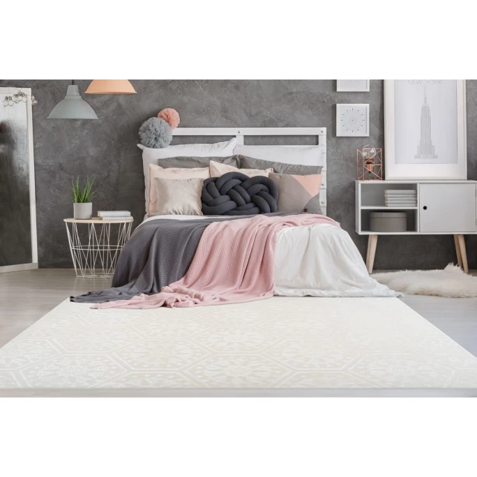 Mit diesem Teppichmodell holen Sie sich ein ganz besonderes Highlight nach Hause. Der einfarbige Kuschelflor ist mit einem Prägedruck versehen, der für eine zweifarbige Wirkung sorgt und gleichzeitig einen 3D-Effekt mit sich bringt. Durch die niedrigeren geprägten Fasern entstehen Höhen und Tiefen in der Oberfläche, die dem Kayoom Teppich Monroe seine besondere Optik verleihen. Rundherum ist der Teppich gekettelt, was ein Ausfransen verhindert und gleichzeitig das Gesamtbild abrundet. Das stilvolle Design passt in nahezu jeden Einrichtungsstil und sorgt in den Wohnräumen für eine angenehme Wohlfühlatmosphäre. In der Haptik fühlt sich der Flor an wie echtes Kaninchenfell und ist somit besonders weich und komfortabel. Durch den Baumwollrücken mit Anti-Rutsch-Noppen wird unerwünschtes Verrutschen des Teppichs verhindert. So kann er optimal als Vorleger vor dem Bett im Schlafzimmer genutzt werden, um direkt beim Aufstehen das angenehme Gefühl unter den Füßen spüren zu können. Aber auch für gemütliche Stunden vor dem Kamin ist dieser Teppich optimal geeignet. Kombinieren Sie den Teppich mit passenden Heimtextilien und schaffen Sie mit stimmiger Beleuchtung eine kuschelige und gemütliche Atmosphäre in Ihrem Zuhause.
