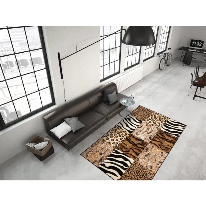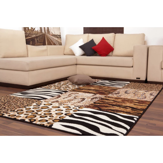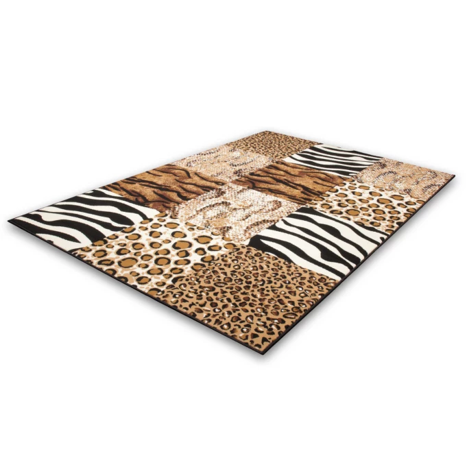 Preiswert und schnell aus Ihrem Zuhause ein top-modisches Wohnreich zaubern geht mit diesem Teppich und den weiteren Modellen aus dieser Reihe ganz einfach. Hier findet sich für jeden Geschmack etwas passendes. Bei dieser Variante erhalten Sie einen unverkennbaren Teppich mit Animal-Print. Zebra-, Leoparden-, Geparden- und Tigermuster treffen im modernen Schachbrett-Design aufeinander und vereinen sich zu einem harmonischen Gesamtbild. Das einmalig günstige Angebot erfreut nicht nur Ihren Geldbeutel, sondern wird Ihnen auch lange Freude bereiten. Der Teppich zieht alle Blicke magisch auf sich, da er den Raum durch sein anmutendes Design einnimmt. Schnell ist er bei kreativem Anschwung neu positioniert und lässt jeden Raum strahlen. Verwöhnen Sie Augen und Füße mit der unbestechlichen Eleganz dieses modernen Flachflorteppichs. Das gewebte Schmuckstück mit unglaublicher begeistert durch seine schwungvolle Eleganz und den kreativen Look. Außerdem ist der Teppich äußerst strapazierfähig und pflegeleicht. Durch das eng verarbeitete Material ist der edel anmutende Teppich auch der Beanspruchung in hoch frequentierten Wohnräumen gewachsen. Auf den Punkt gebracht: Dieser Kayoom Teppich USA bietet ein Höchstmaß an Behaglichkeit. Der Teppich ist seitlich durch eine Kettelung eingefasst, um Ausfransen zu verhindern.